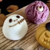 白(おばけたち):琥珀糖にすり蜜(砂糖を乳白色に結晶化させたもの)を加えて真っ白に仕上げた寒氷(かんごおり)と呼ばれる半生菓子です。すり蜜をさらにくわえているので琥珀糖よりも甘く、しっとりした食感です。