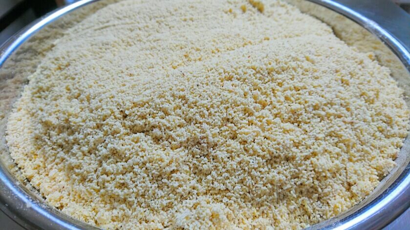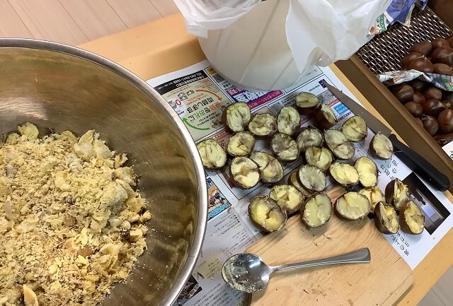 砂糖を加えて栗きんとんに。これに白あんを加えて和栗あんにしています。